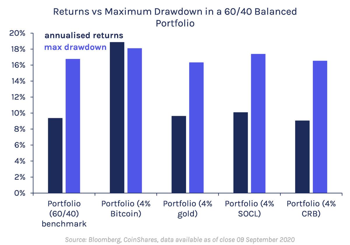 What is striking, is that over the same period none of the other comparable assets or indices offer the same diversification benefits. What also makes bitcoin stand out is its asymmetric return profile, that is, the upside it provided versus the downside. Despite bitcoin’s volatility, a 4% portfolio weighting does not materially increase the maximum drawdowns (i.e. the maximum possible loss from peak to trough) relative to other assets, while its annualised returns are close to double that of the other alternatives.