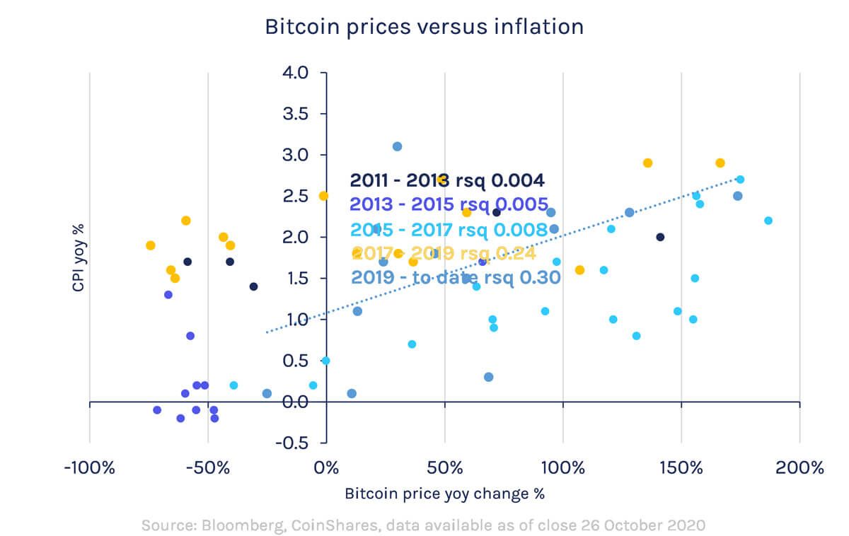 An early observation to make is that Bitcoin’s relationship with inflation since 2017 has been improving as it started being used as a store of value. Because of its characteristics (scarcity, liquidity, high uptime), evidence suggests investors are increasingly using it as a store of value, the very features that theoretically help protect from inflation and debasement of fiat money supply.It is important to highlight that this is unlikely to detract from its other compelling functions such as digital ownership, security, providing immutable and traceable records as well as programmable money.